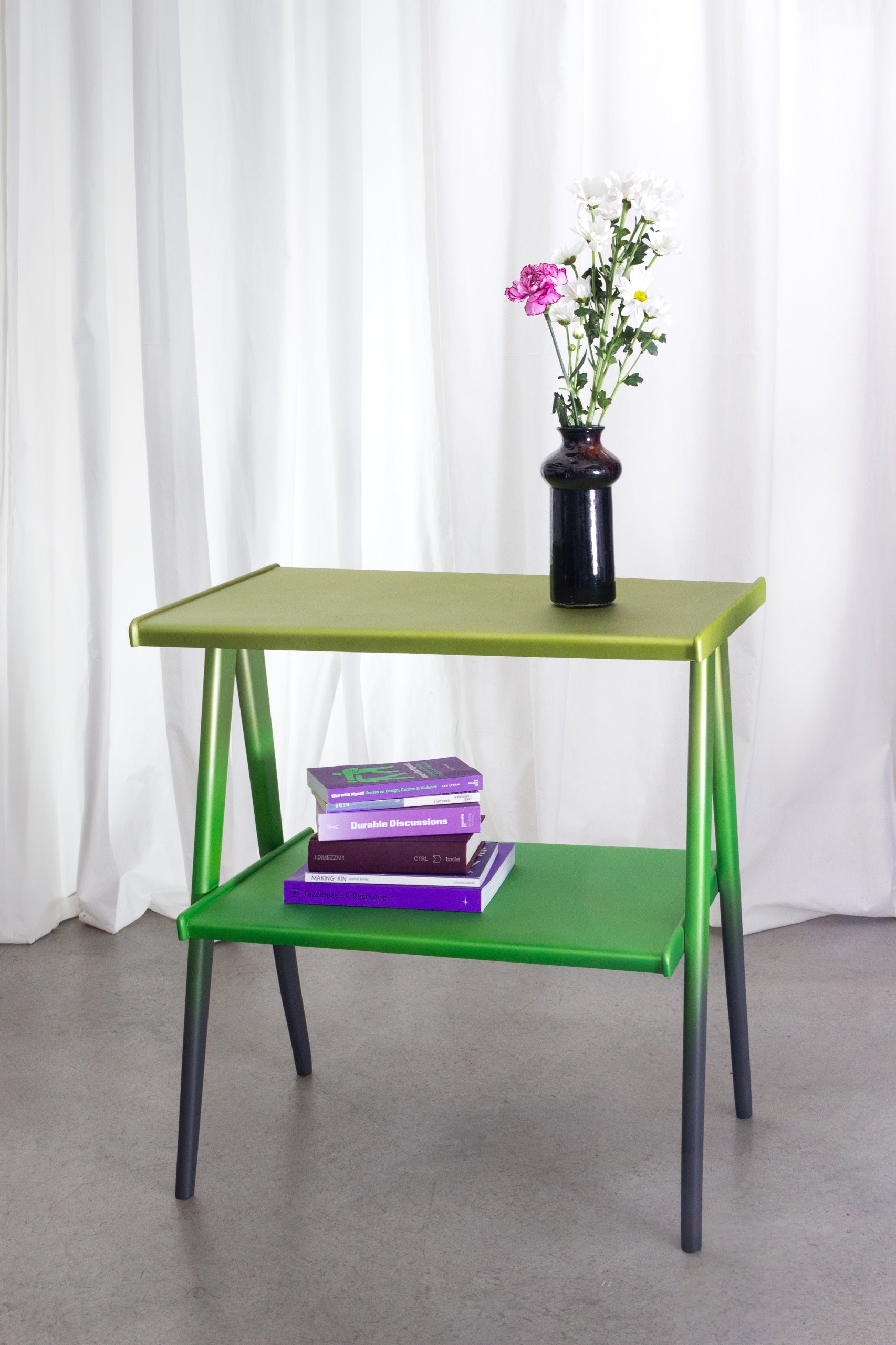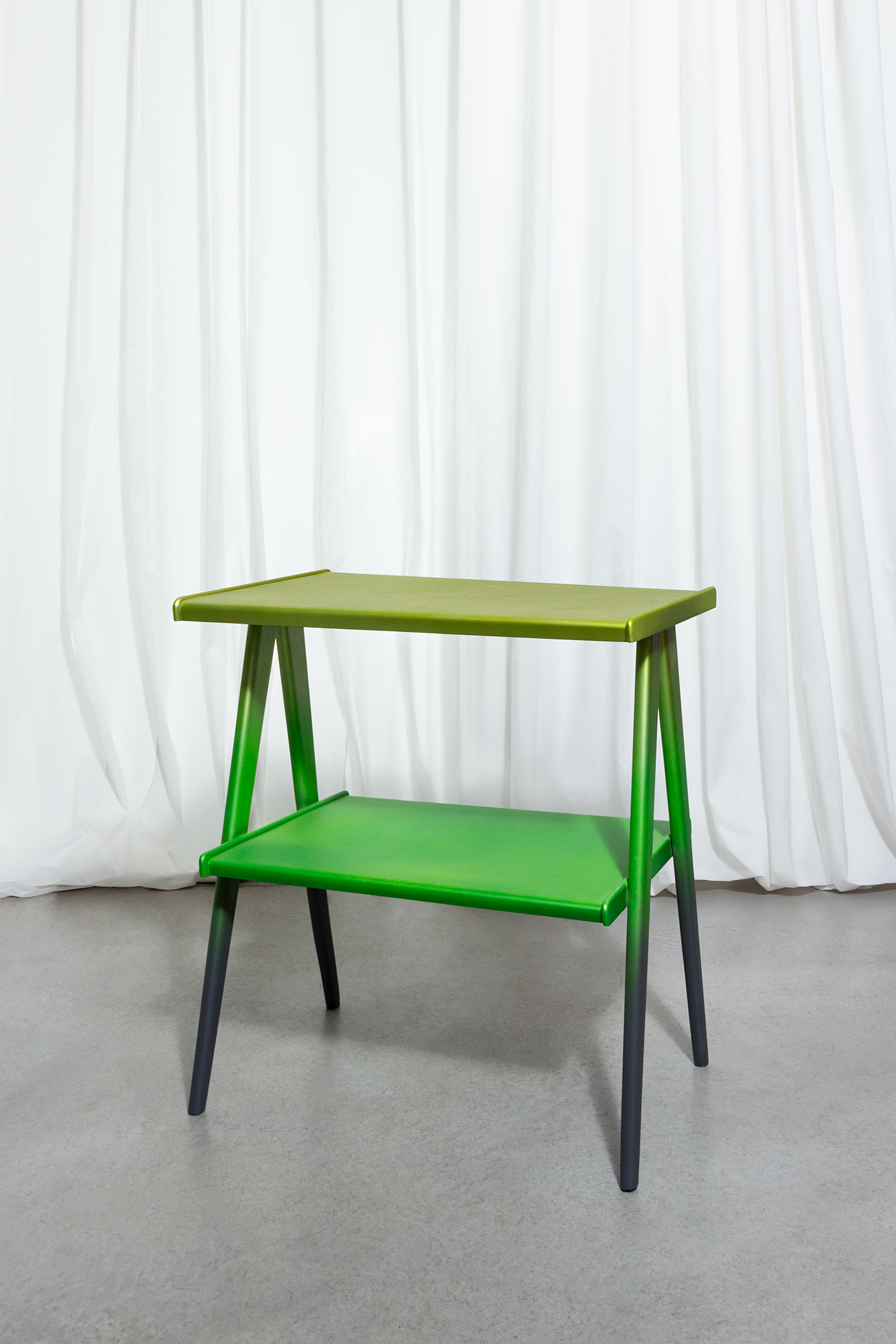 The Greener Side Table, airbrushed with a metallic finish and grey gradient legs, reminds of a dragonfly - slim and elegant.