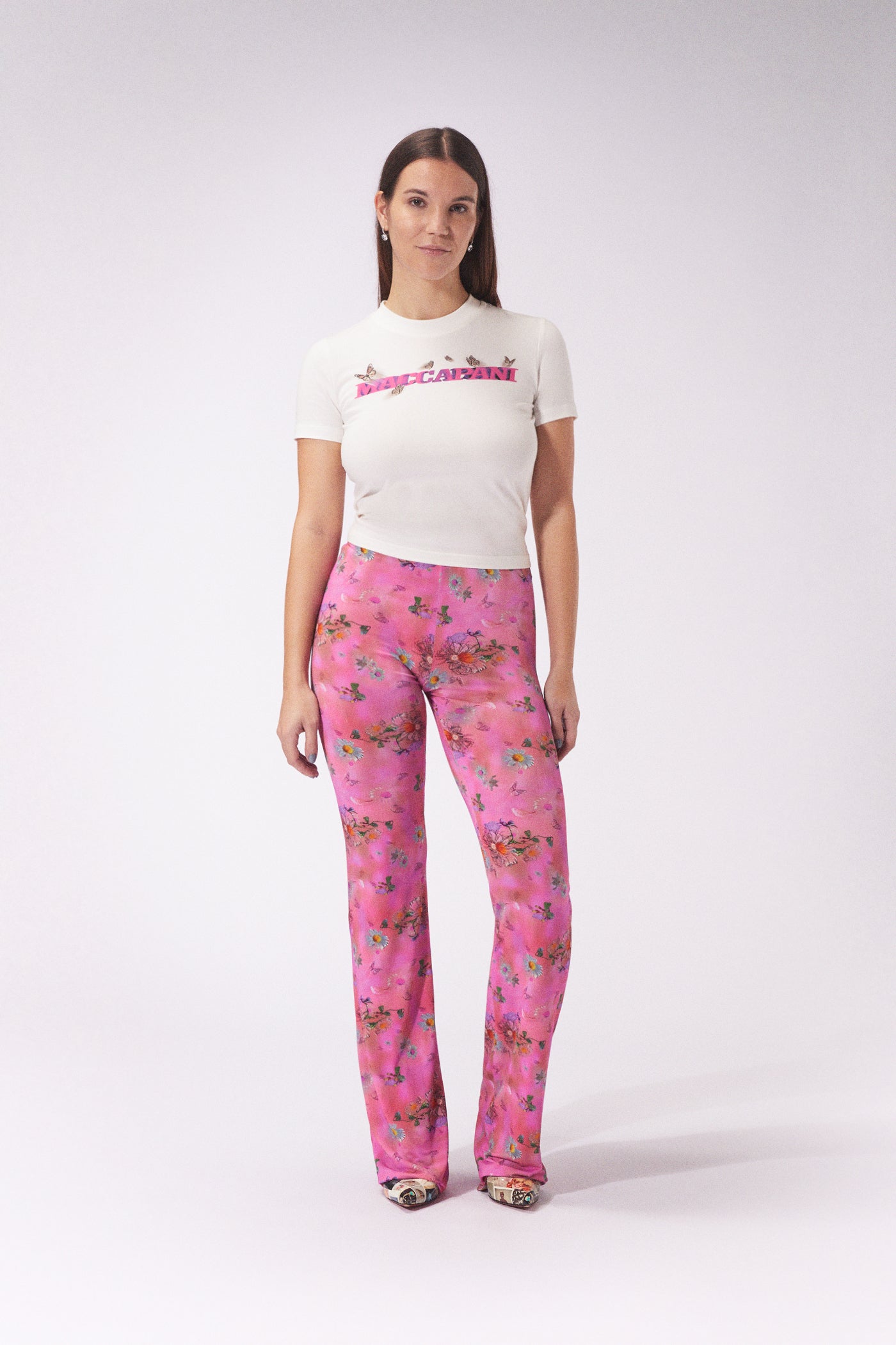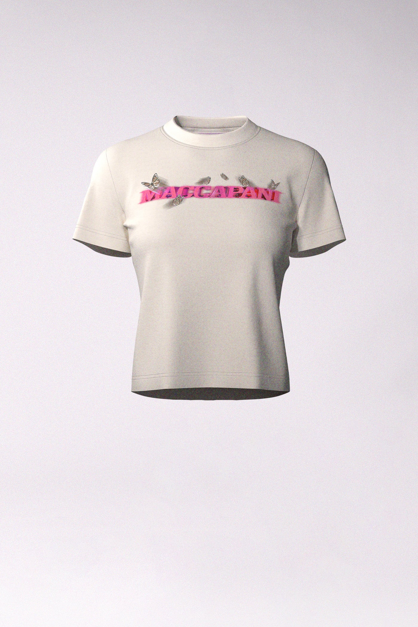 A tight, cropped, fitted t-shirt that adheres to the body, the BABY T features the MACCAPANI logo with butterflies on the front: playful yet bold.