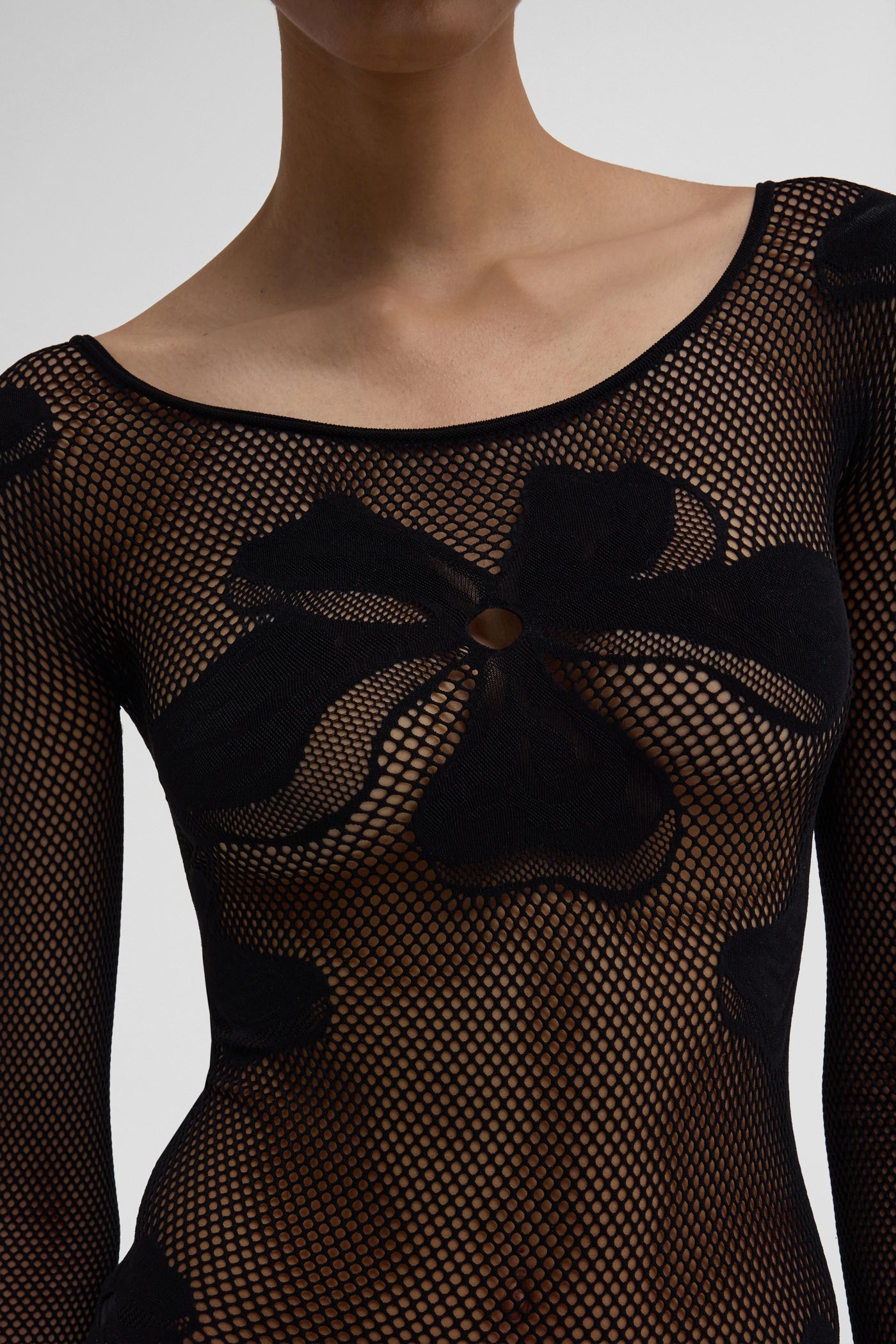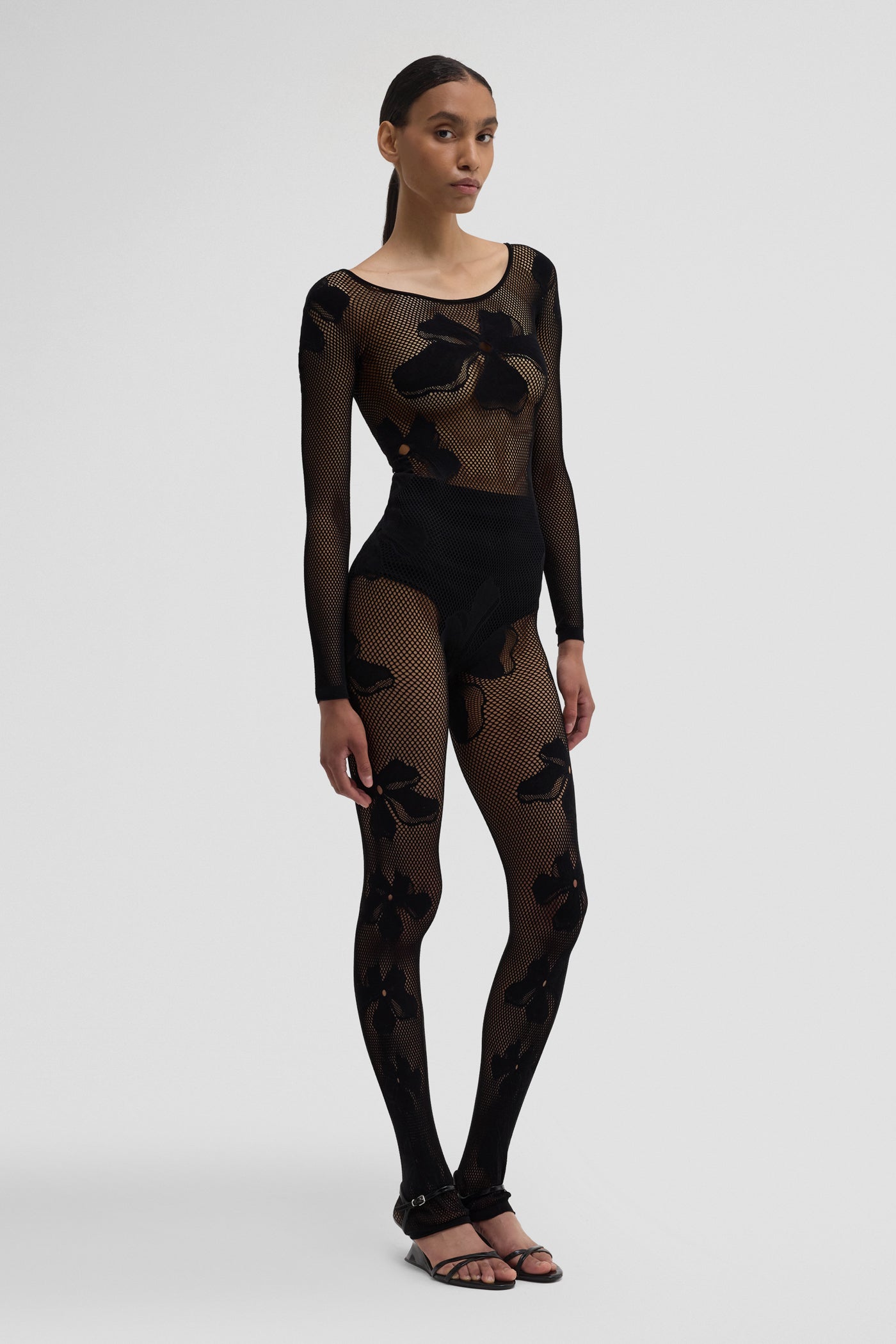 An edgy update to the bodysuit, the MONOGRAM CATSUIT is crafted from semi-sheer mesh with all-over monogram intarsia. Form-fitting and elegant.