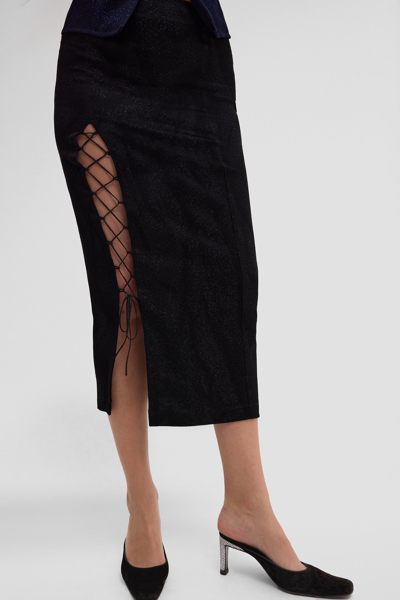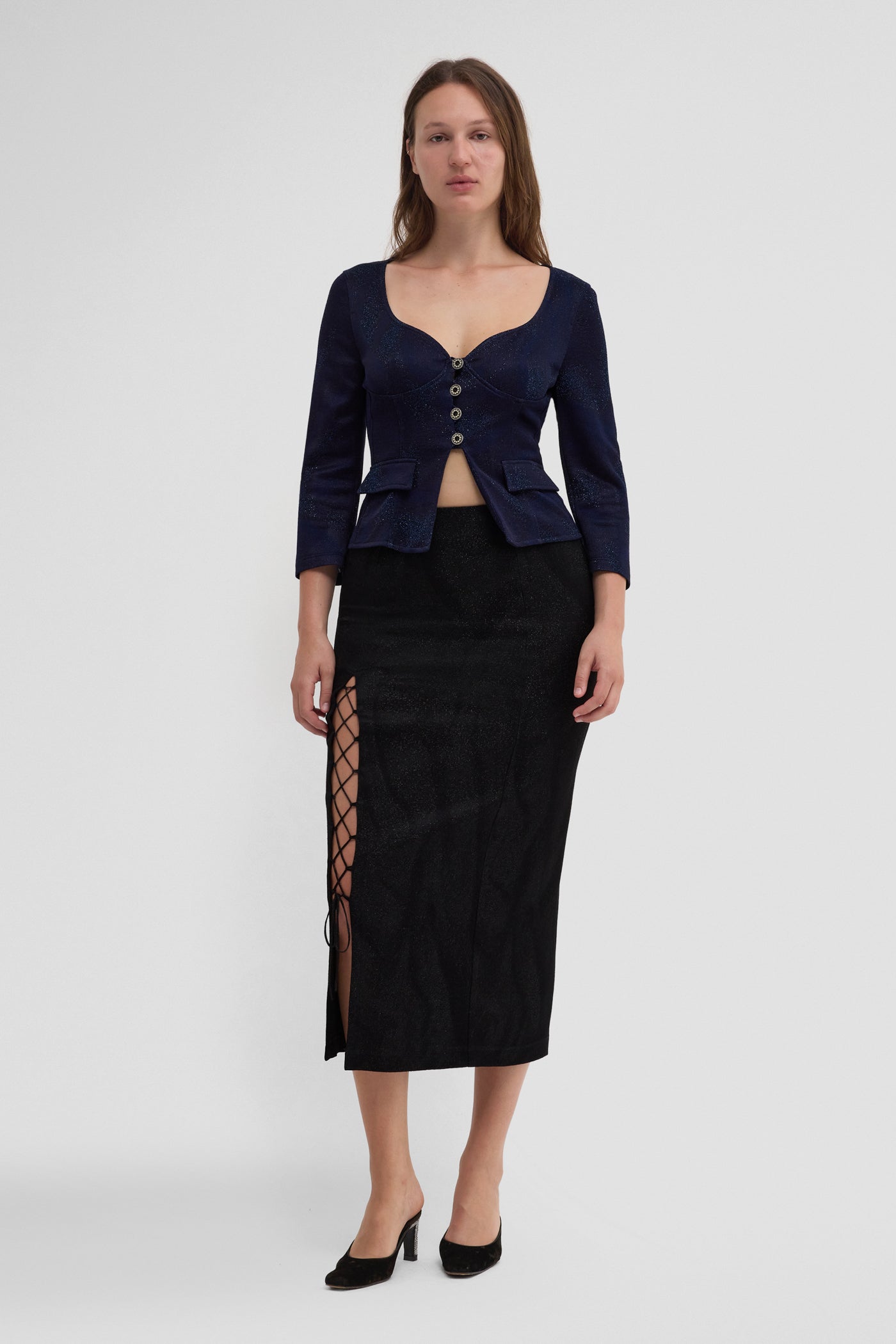 Decisa ma raffinata, la SCIO SKIRT in nero intramontabile è pensata per accompagnare ogni tuo movimento, lasciando il segno con discreta audacia. Indossala con il COMFY CORSET coordinato per un look audace, oppure sotto il TATS BLAZER per un’eleganza più composta.