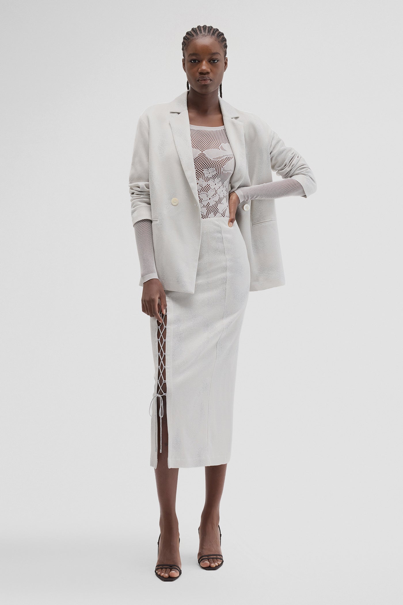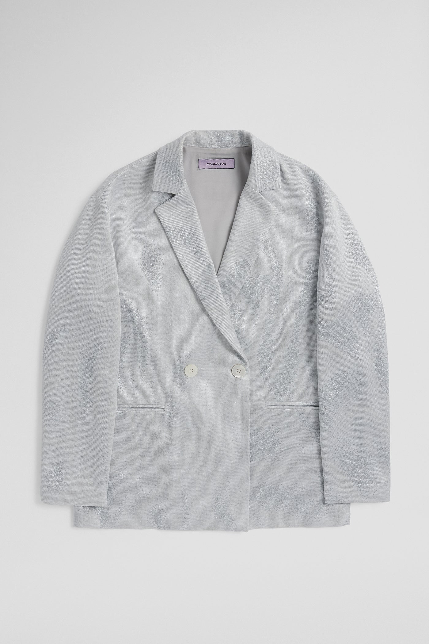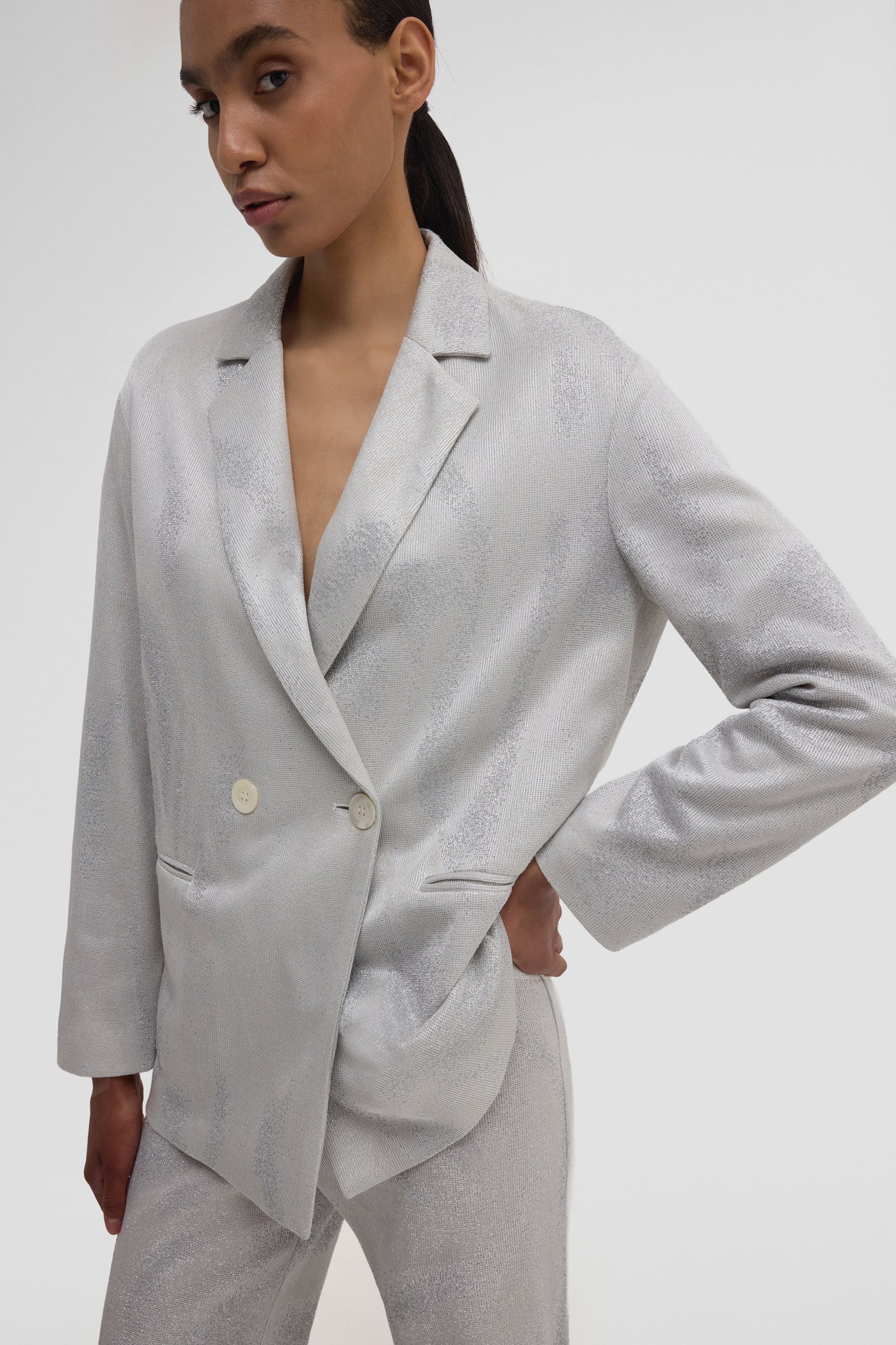 Il TATS BLAZER in jacquard bianco argento è perfetto per valorizzare i neutri del tuo guardaroba. Un classico del tailoring rivisitato con un tocco moderno e giocoso. Indossalo sopra un abito scivolato oppure abbinalo agli EASY PANT coordinati per un look completo ed elegante.