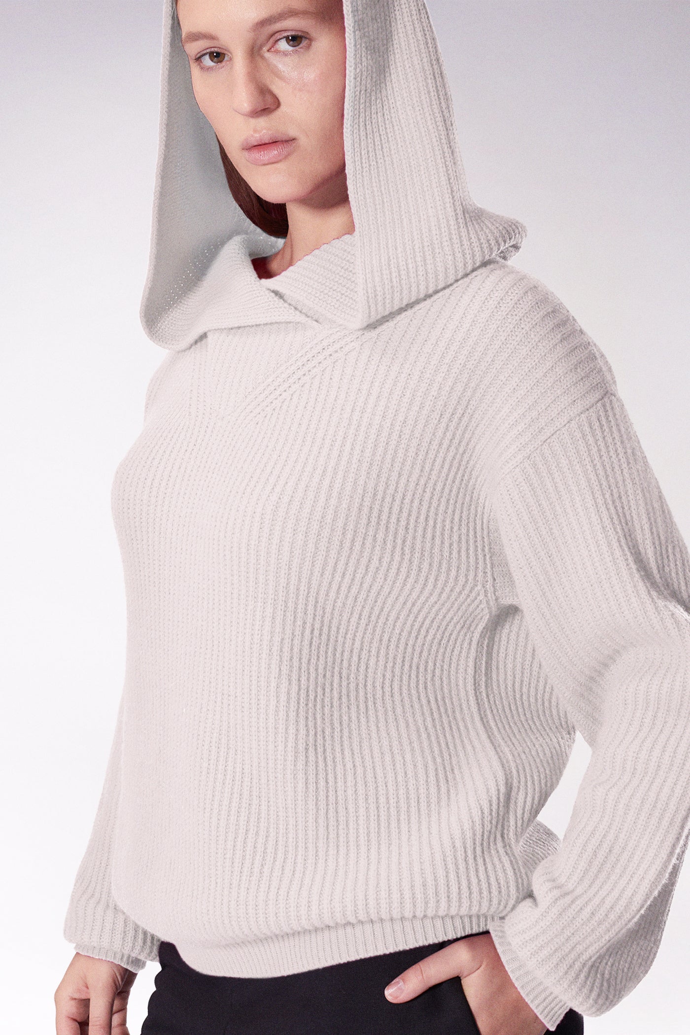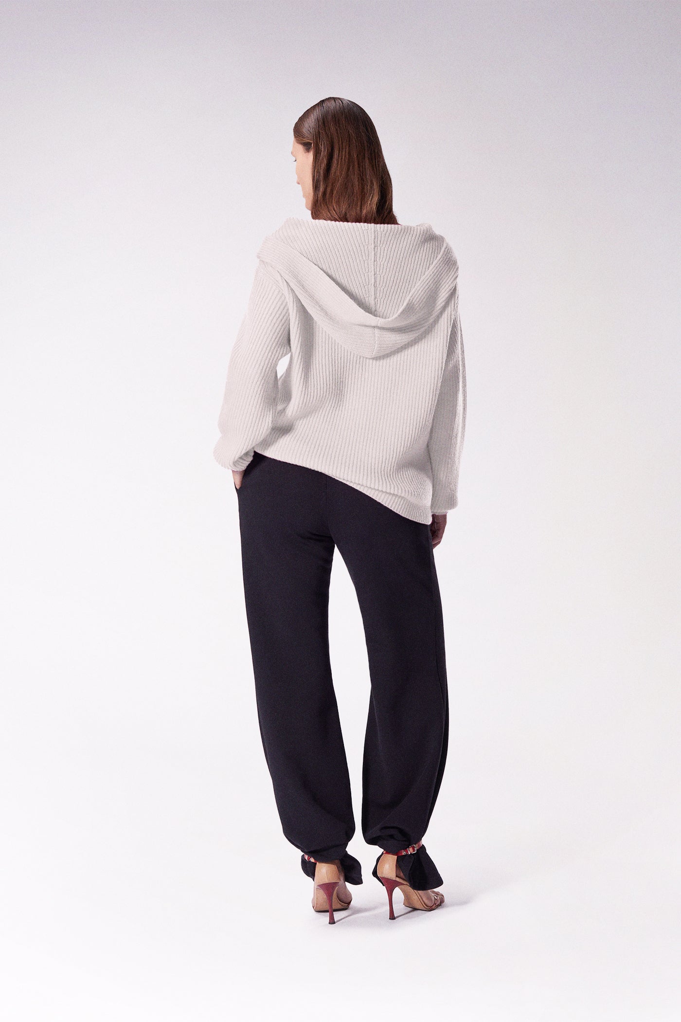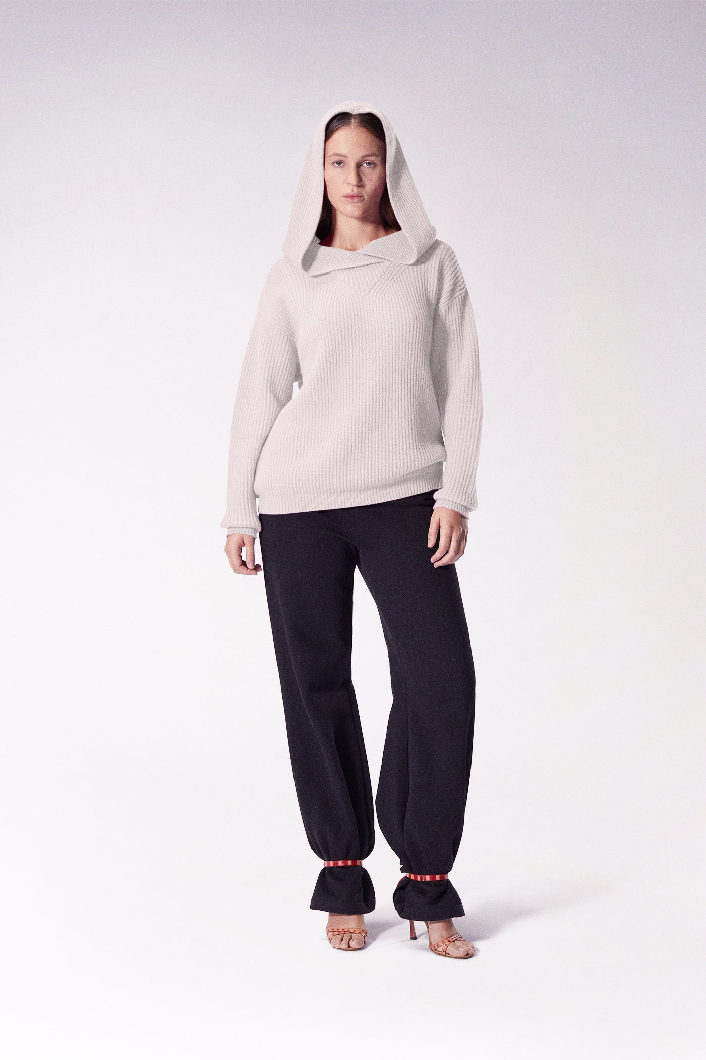 Realizzata in pura lana, la felpa in maglia "KNITTED HOODIE" in off white si distingue per la sua tecnica di lavorazione a punto pannocchia. Leggermente oversized e dotata di cappuccio, è ideale per giornate rilassate o outfit casual. Made in Italy.
