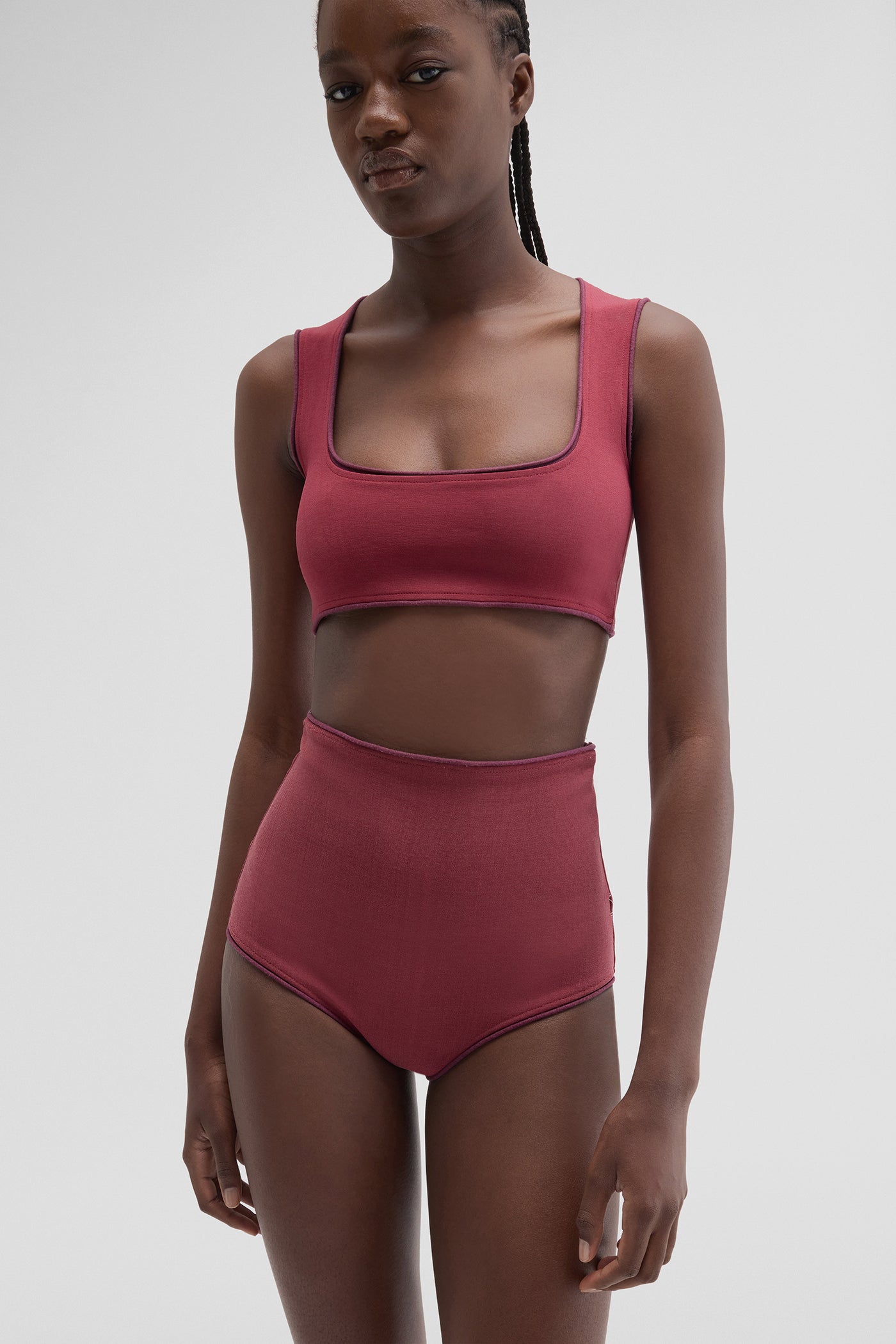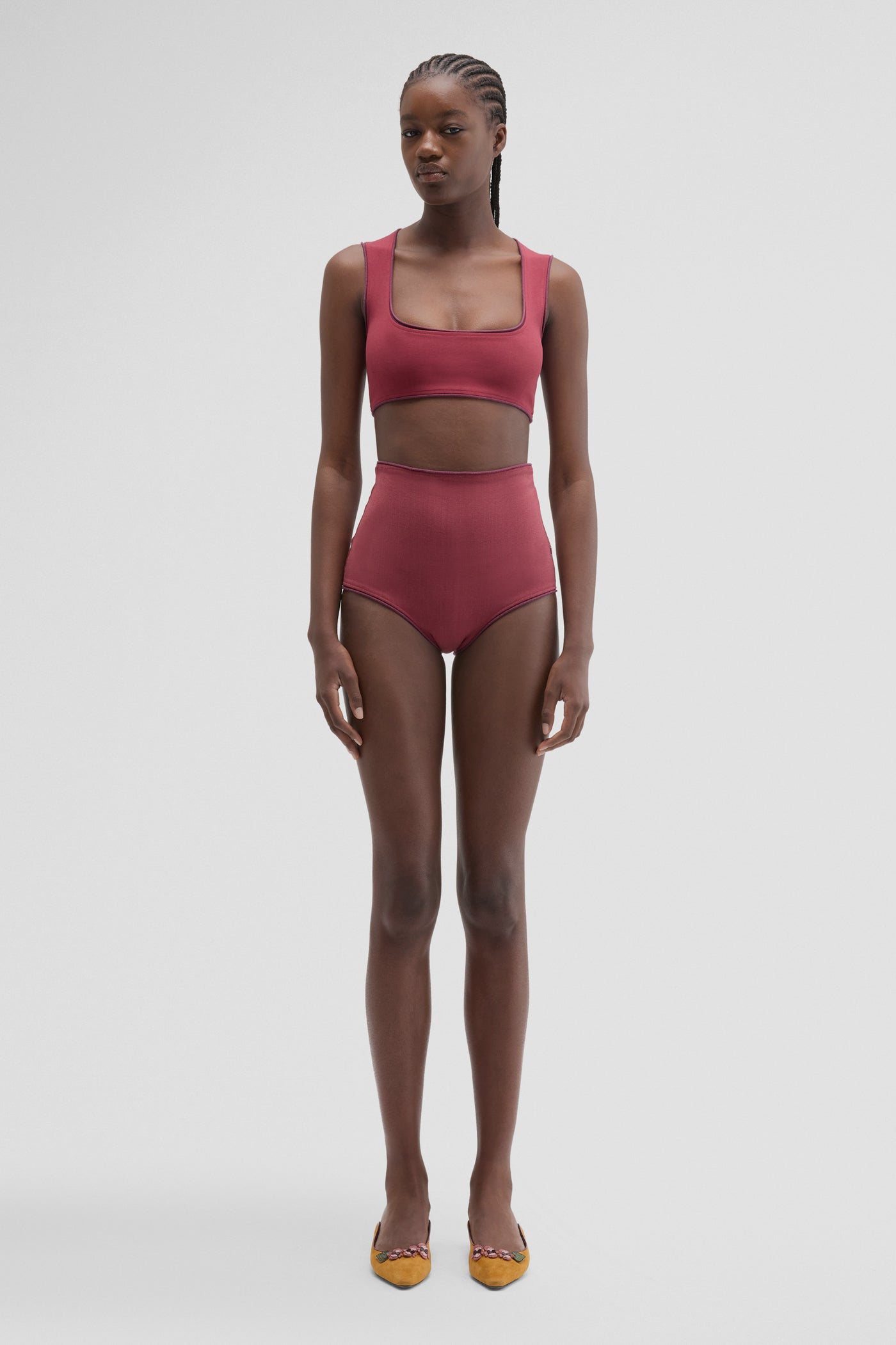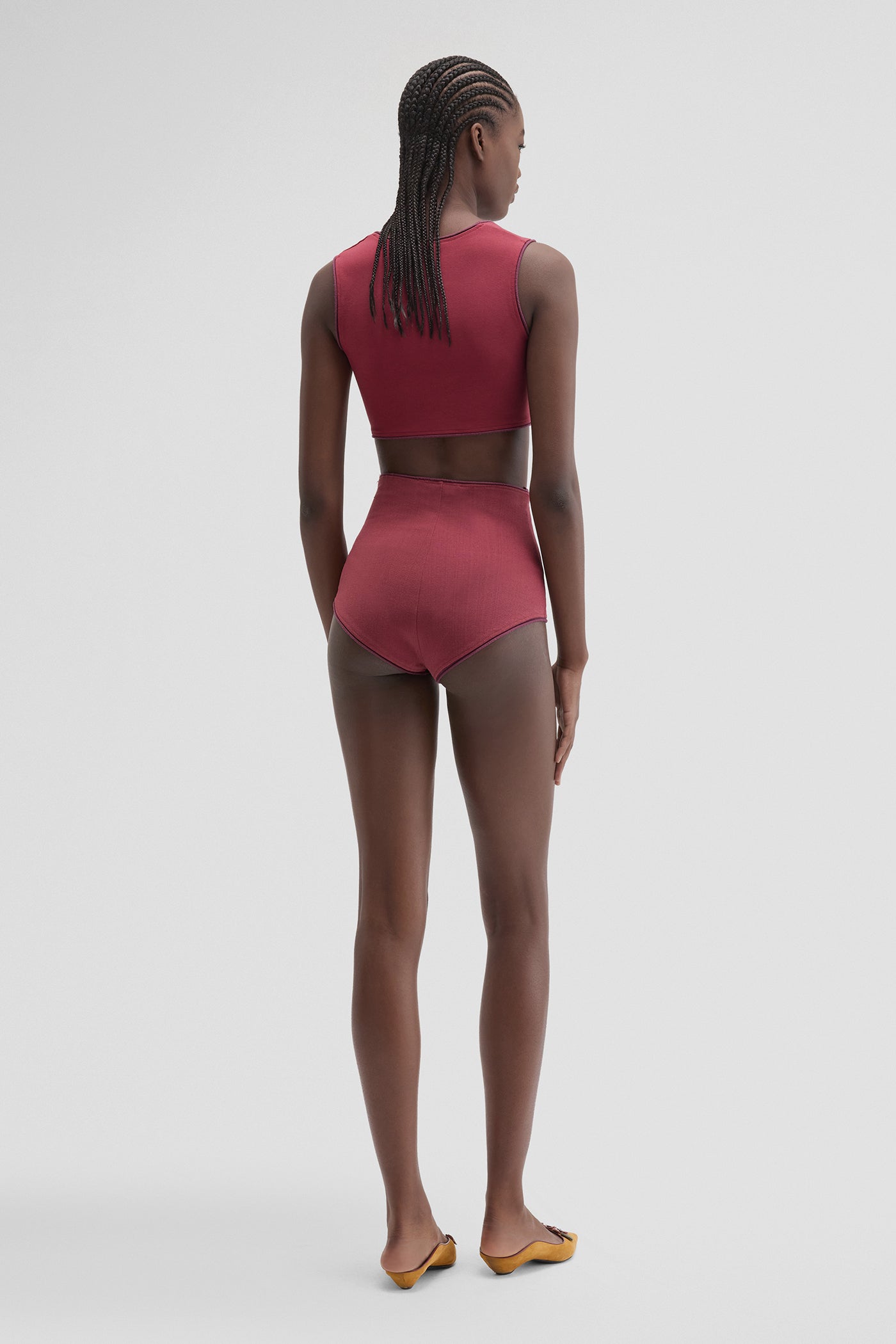 MACCAPANI’S MICRO-SHORT in wine red turn a lingerie look into daytime wear. Cut ultra high on the thigh, they have a sculpting silhouette that promises to show off legs to maximum effect. Wear it solo or pair it with a PERFECT BRA-TOP to complete a look with a sheer over-piece.