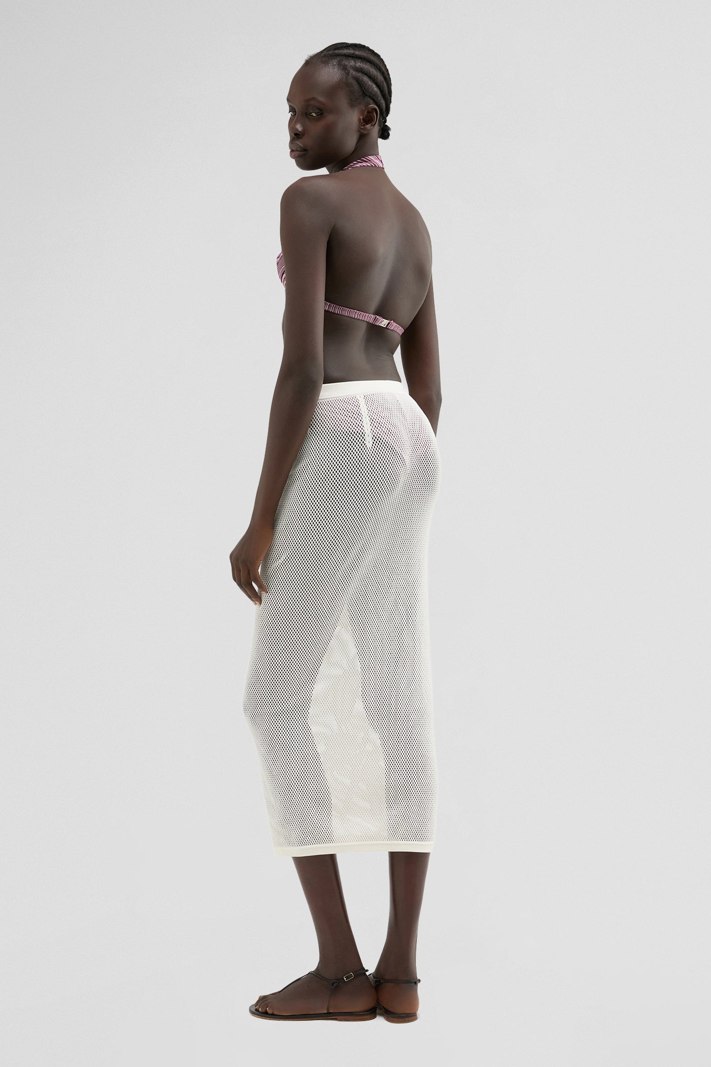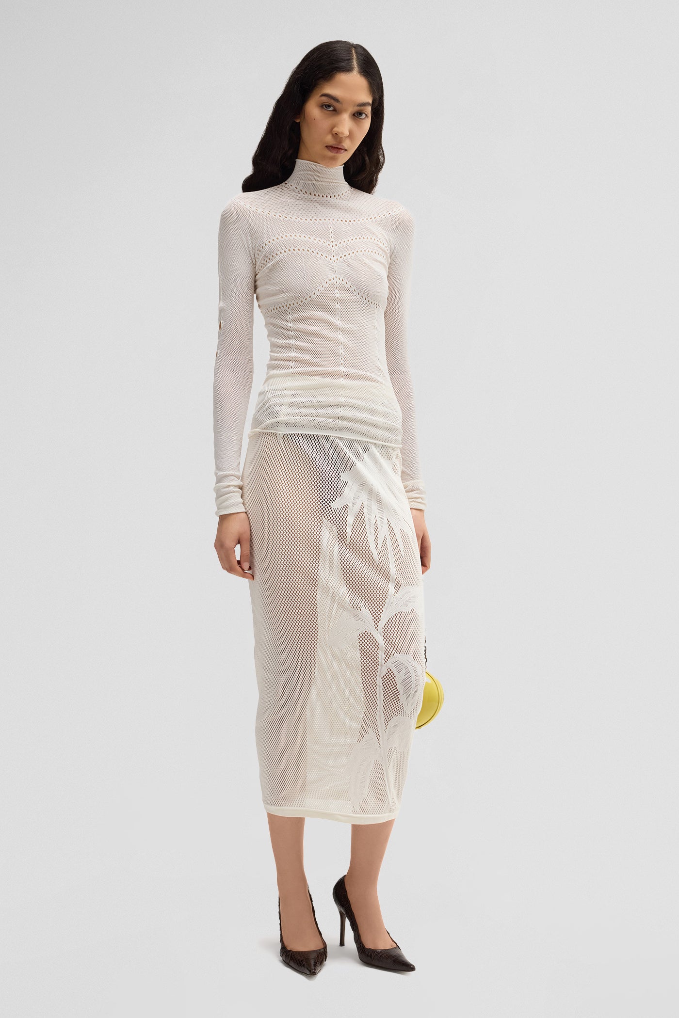 The SEAMLESS OVERSKIRT in off white is a lightweight second-skin layer, crafted in sheer mesh with refined intarsia detailing. Seamless, sleek, and made with advanced no-stitching technology for a fluid, effortless silhouette.